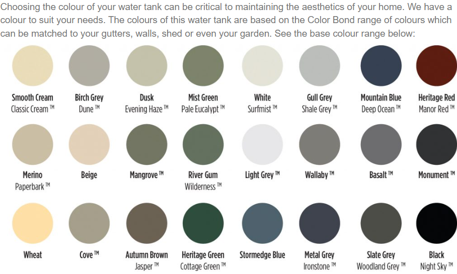 Beige , Birch Grey , Black , Heritage Green , Heritage Red , Merino , Mist Green , Monument , River Gum , Slate Grey , Smooth Cream , Storm Edge Blue , Wheat