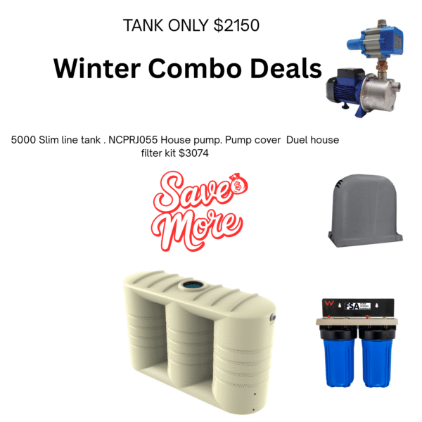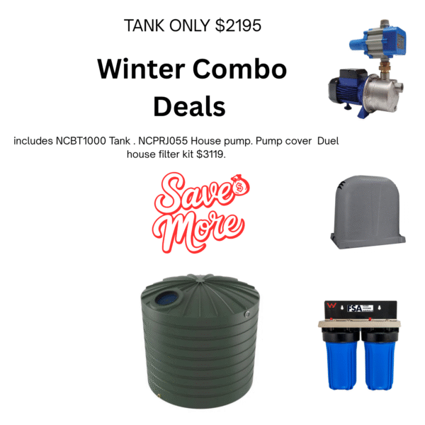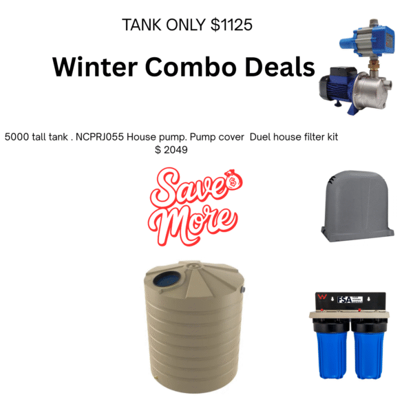 Winter Tank Combo 1 x prj055 jet pump 1 x pump cover 1 x duel 10 inch x 4.5 inch house filter includes 1 x 5 m sediment carriage 1 x 5 m carbon block cartridge.